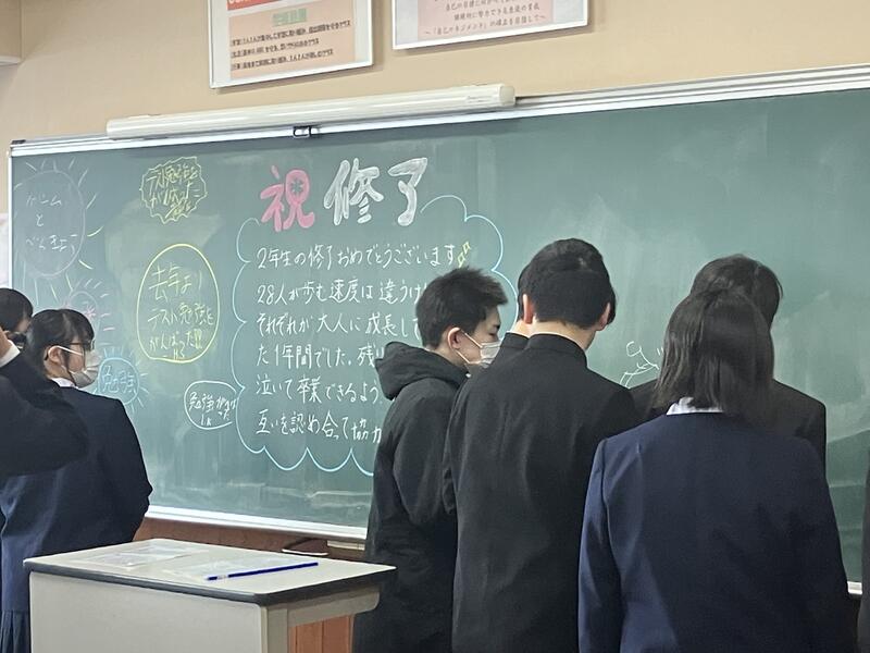 朝、教室を回っていると2年生の教室には、「祝 修了」のメッセージ。生徒一人一人もメッセージを書き込んでいました。