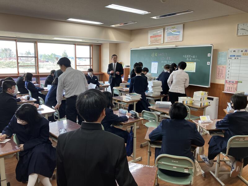 修了式後は、生徒指導の先生から「交通事故に気をつける」「不審なメール等には十分気をつける」「友人とのSNSのやり取りで注意すること」についてお話がありました。