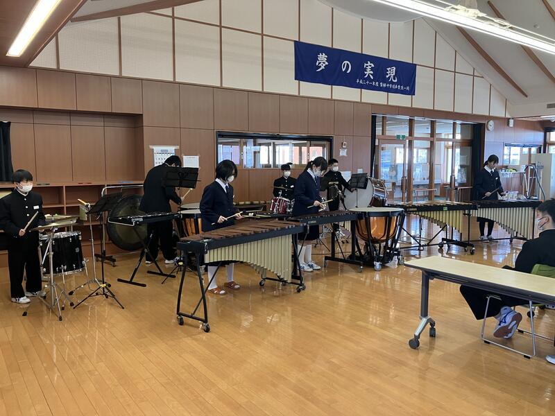 また、始業式後には今週末県大会に参加するアンサンブル部の「打楽器七重奏」の演奏披露がありました。