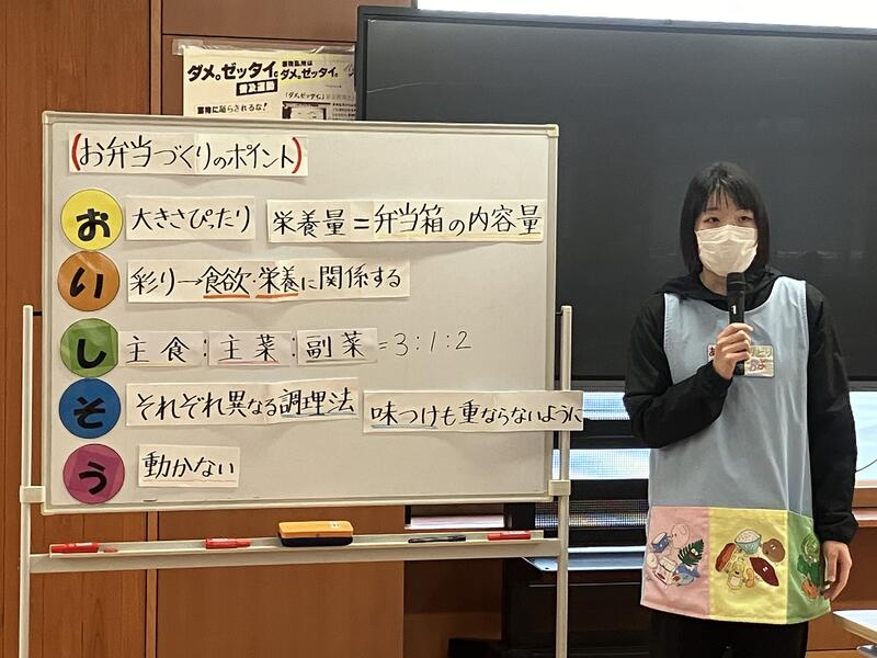 今日は栄養教室で、栄養教諭からお弁当作りのポイントを「お・い・し・そ・う」で教えていただきました。