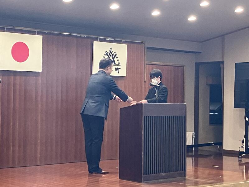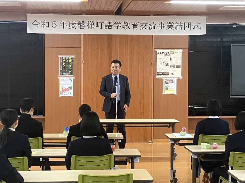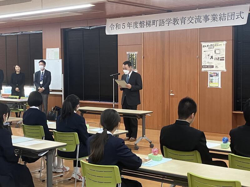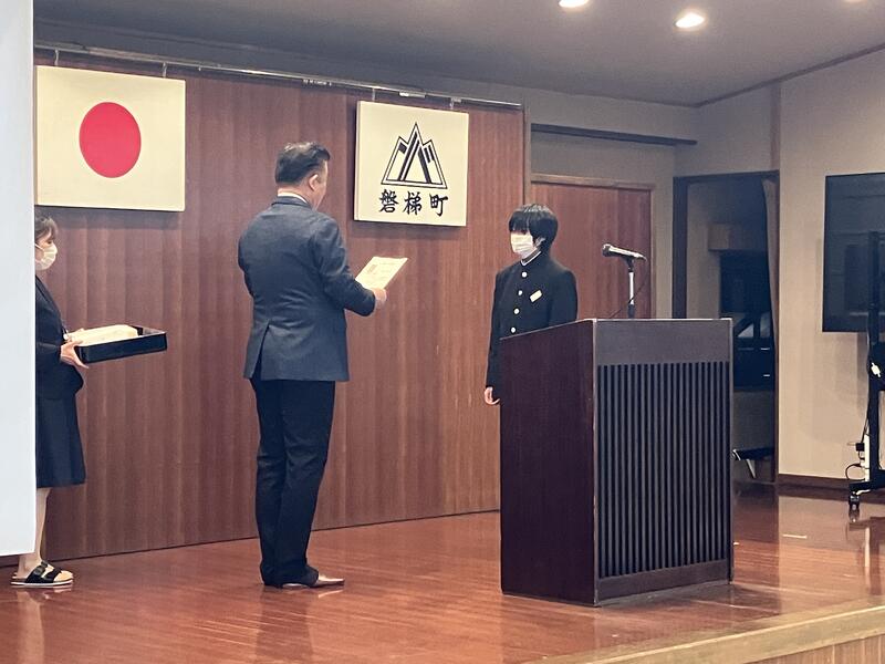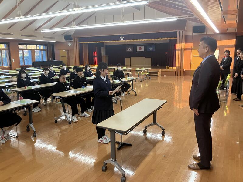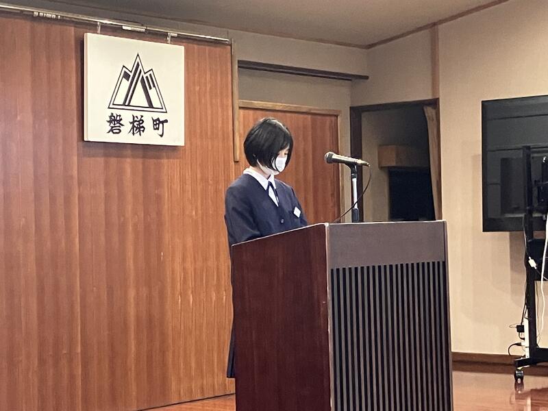 磐梯町長様、磐梯町教育長様からご挨拶をいただき、生徒を代表して2年生の女子生徒が