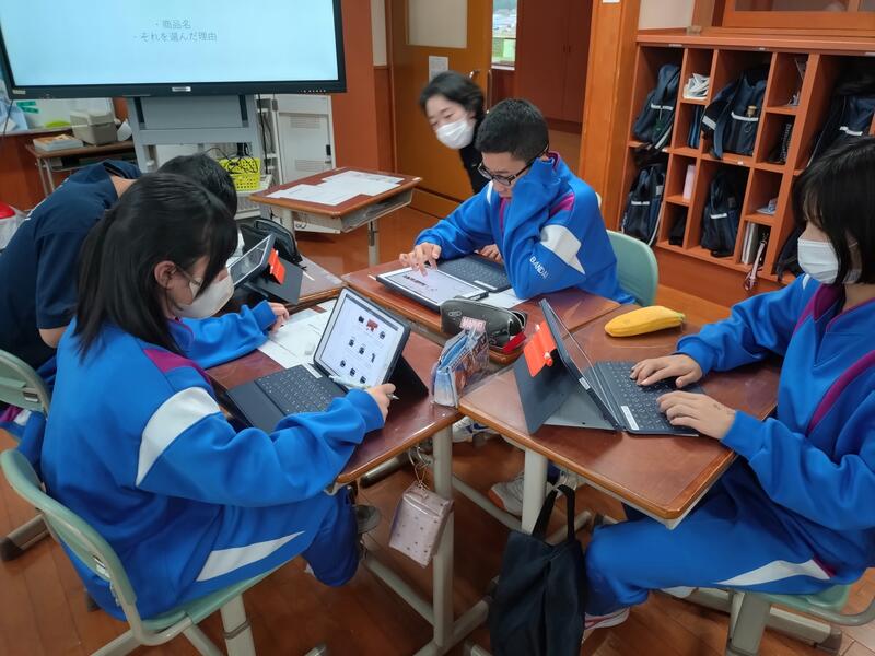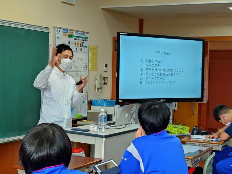 その後、商人体験に向けて、どんなものを売りたいのかを班ごとに考えました。磐梯町のふるさと納税のホームページを見たり、道の駅で扱っている商品などを参考にしながら、各班で考えていました。