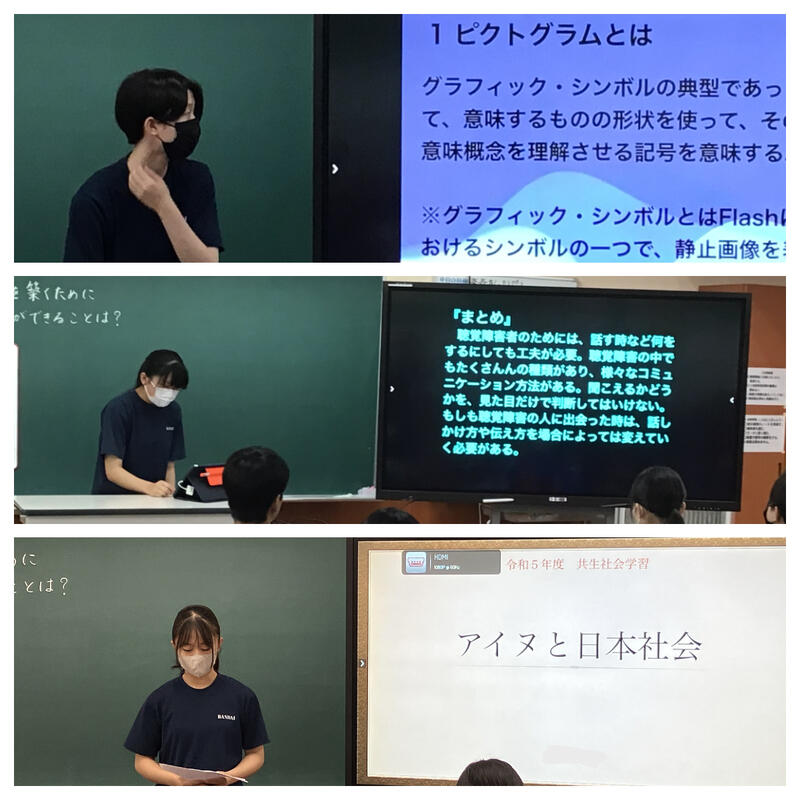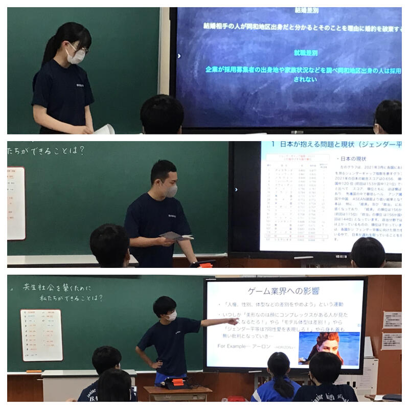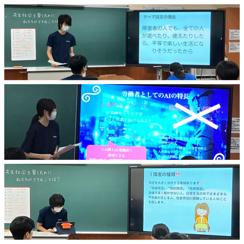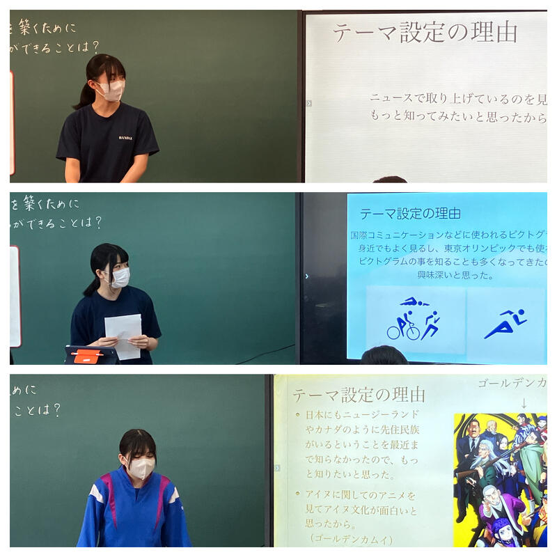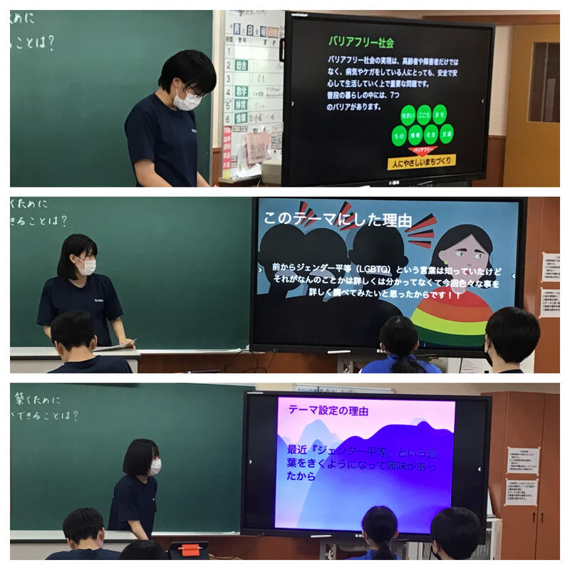 3年生は、それぞれが「障がい」「ジェンダー」「アイヌ」「AI」などなど、様々な側面からそれぞれ調べたことや、自分の考えを発表していました。