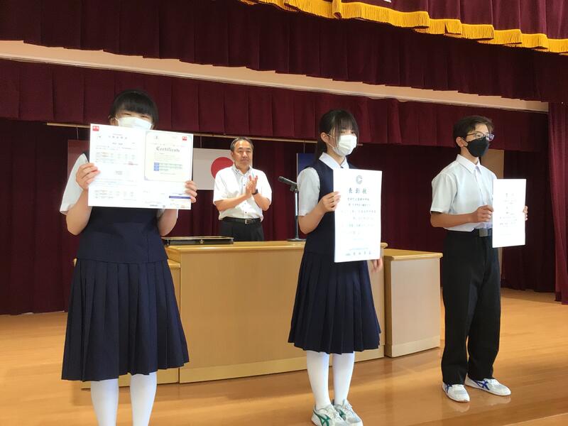 吹奏楽コンクール会津支部大会金賞、中体連水泳100m背泳ぎ3位、英語検定合格者の表彰を行いました。