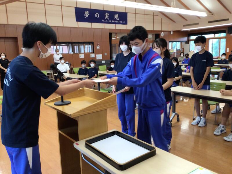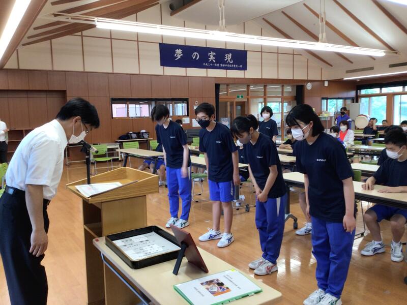 まずは、中体連陸上と水泳大会の表彰、そして先日の歯科優秀賞、バレーボール春季大会の賞状伝達を行いました。
