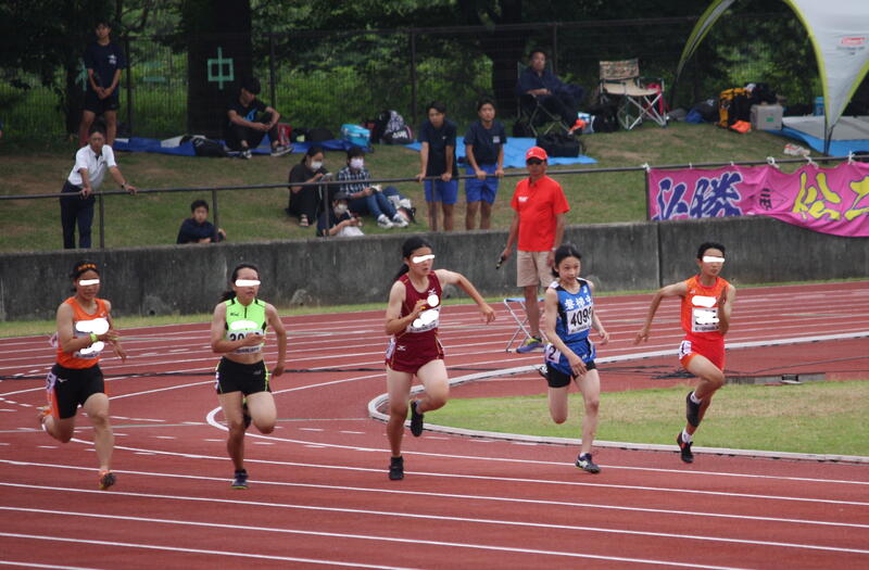 本校からは2年女子100mに出場します。本日は予選でした。各組の3位までと全体のタイムで+4人が明日の準決勝に進出できます。