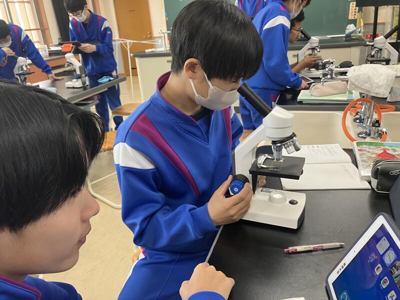 2年生の授業をのぞいてみると、顕微鏡の観察を行っていました。