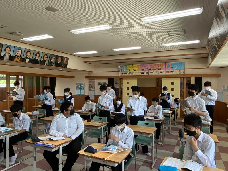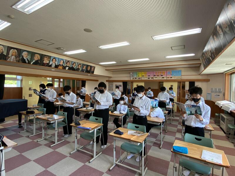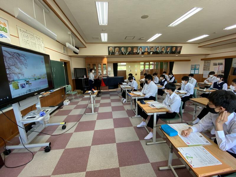今日の授業風景 ~3年 音楽~ 2022年5月30日 12時05分 3年生の音楽の授業では滝廉太郎の「花」について学習しています。歌うときの姿勢や眉、目、口などのポイントを意識しながら歌っていました 音楽室の窓や扉を全開にして、感染予防対策に万全を期して授業を行っています。