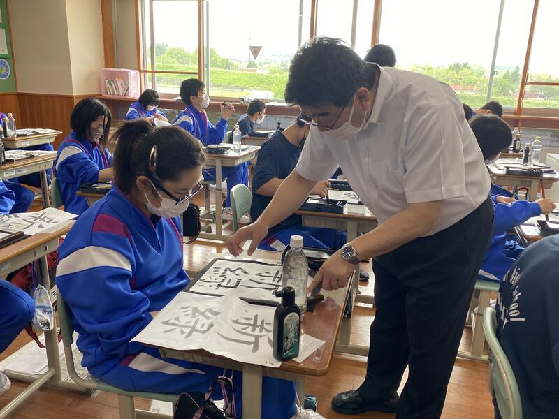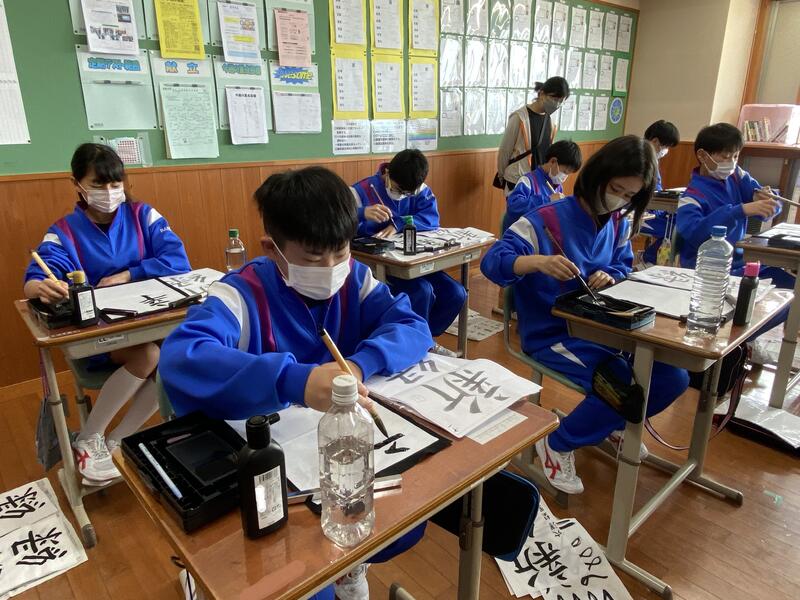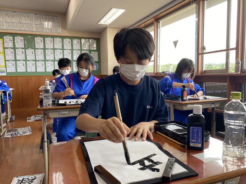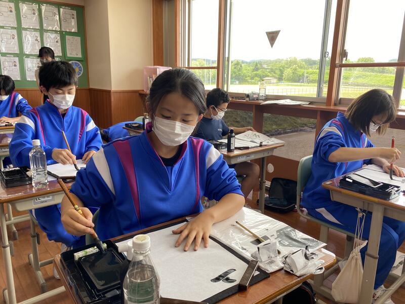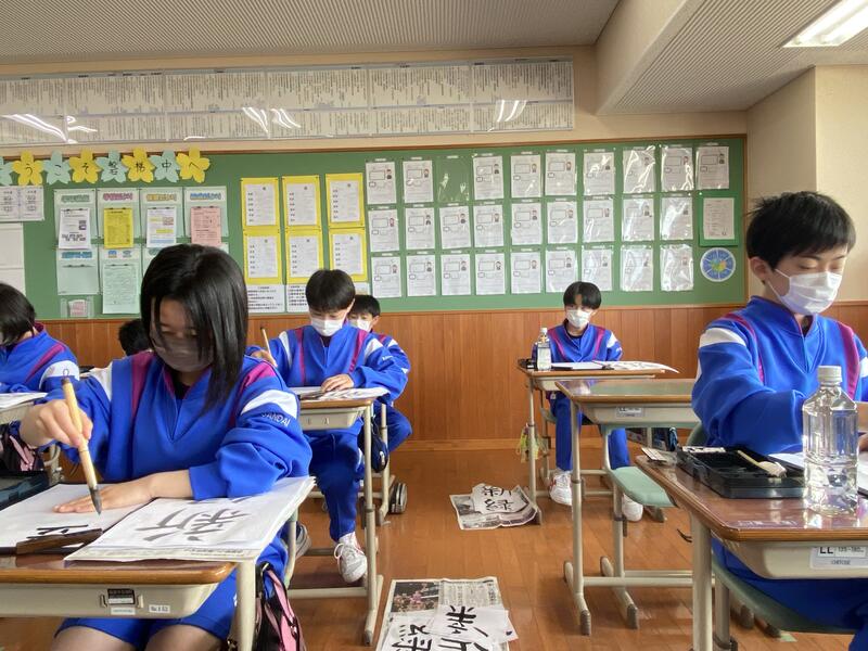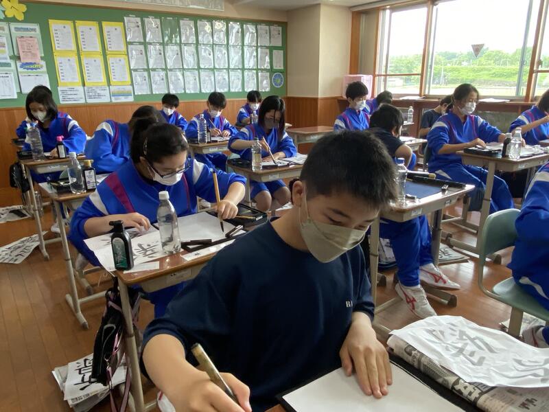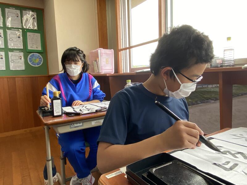 1年生が昨日に続いて、国語の時間に書写をやっていました。1年生の課題は「新緑」です。お手本を見ながら集中して何度も練習していました。