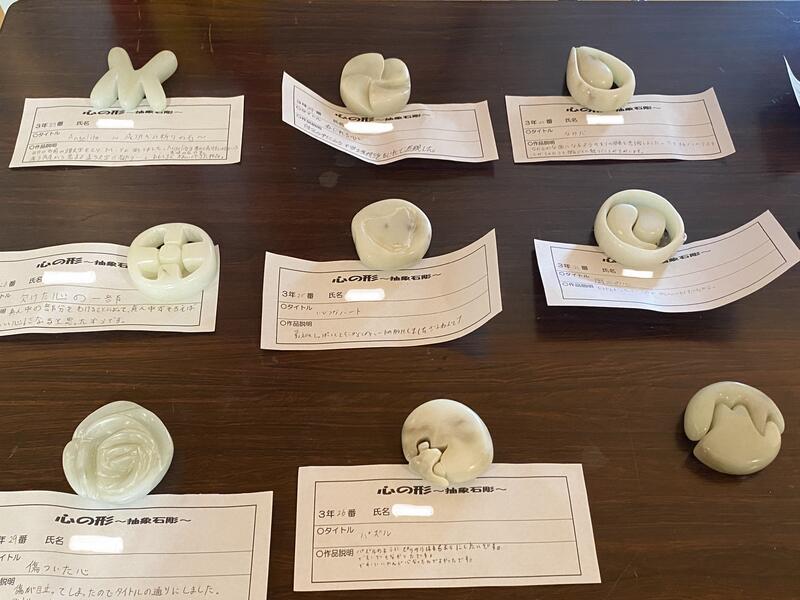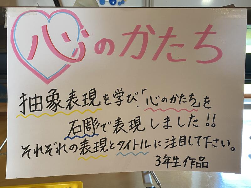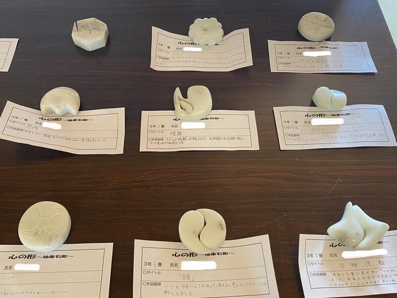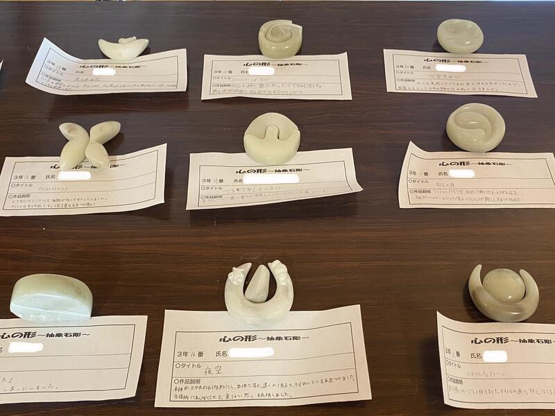 今年度も、玄関ホールに磐中美術館が開館しました 今回は、3年生が「心のかたち」をテーマに制作した石彫の作品が展示されています。
