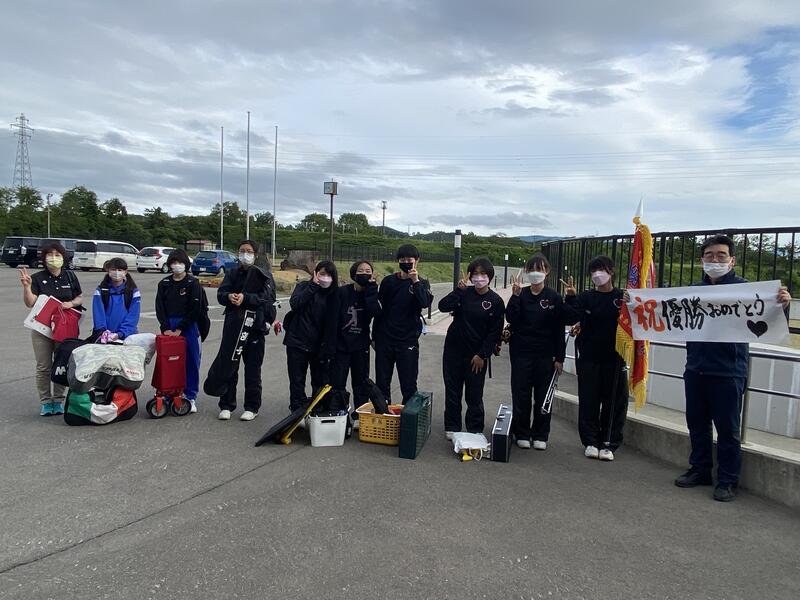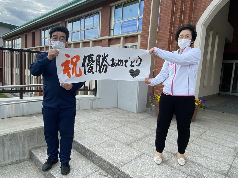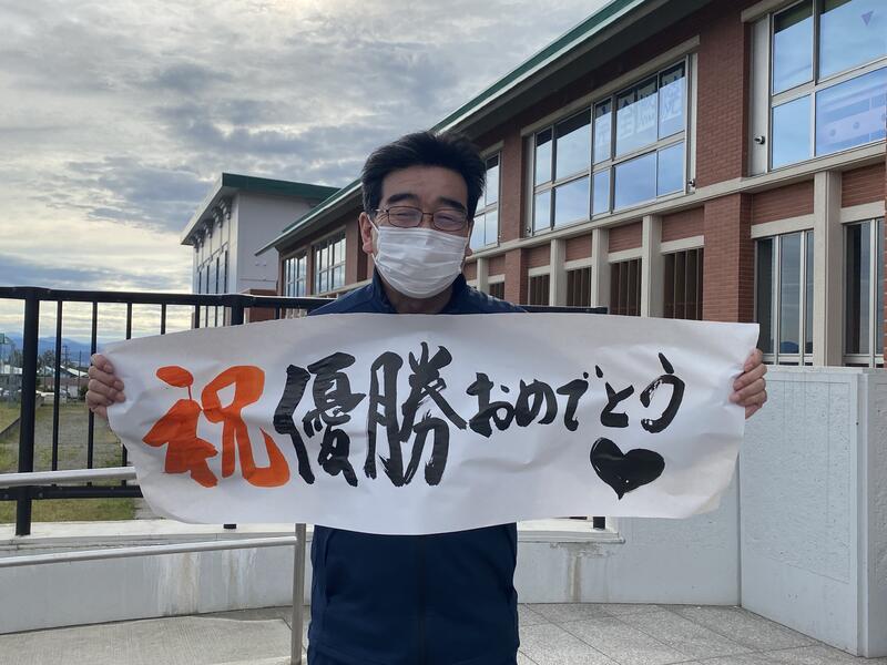2022年6月15日 18時45分優勝したバレー部の皆さんが学校に戻ってくると、K先生とY先生が横断幕を持って出迎えてくれました。
