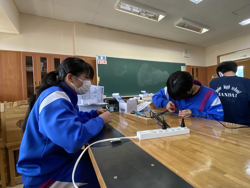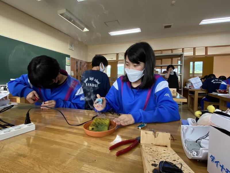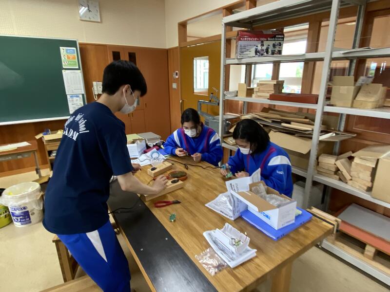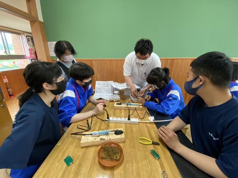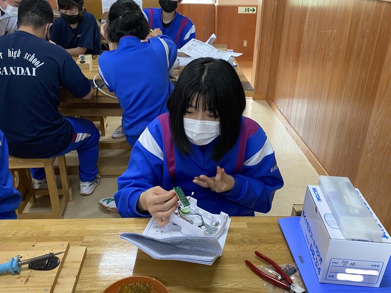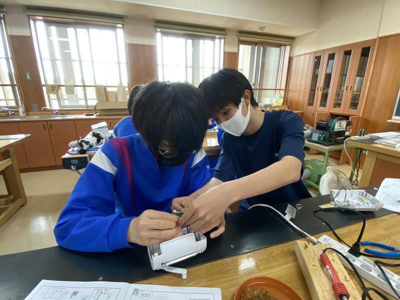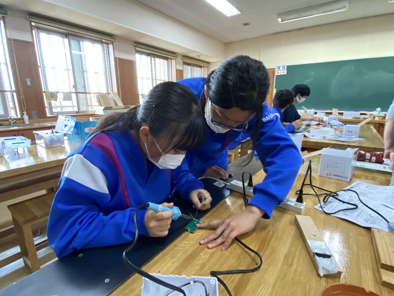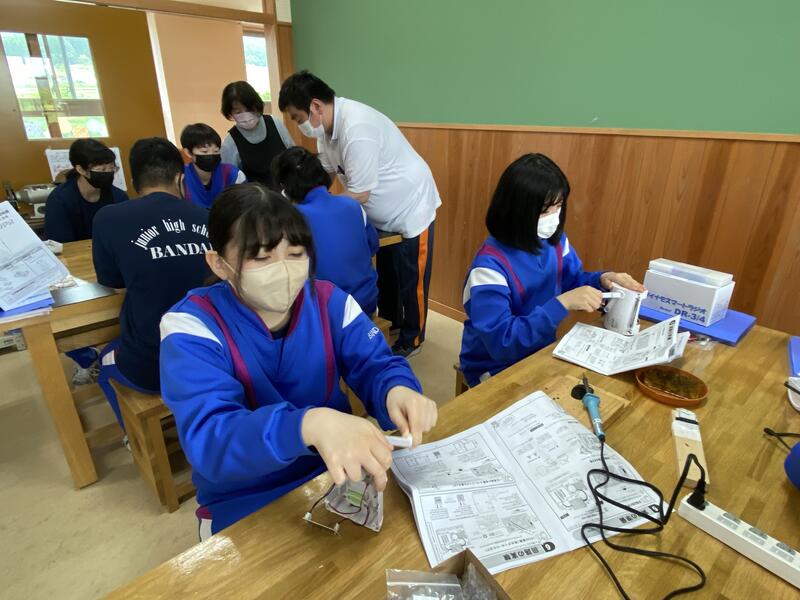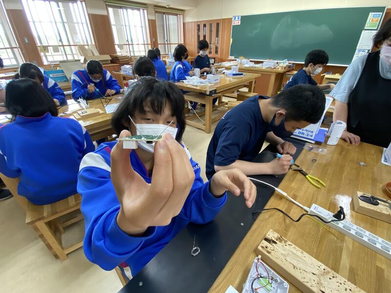 今日の授業風景 ~2年 技術~ 2022年6月16日 13時00分 2年生の技術の授業では、手回しラジオの製作に入りました。ハンダ付けも練習の成果がバッチリでているようです きちんとハンダ付けがされて電気が流れているか、ハンドルを回して確認しながら製作を進めています。