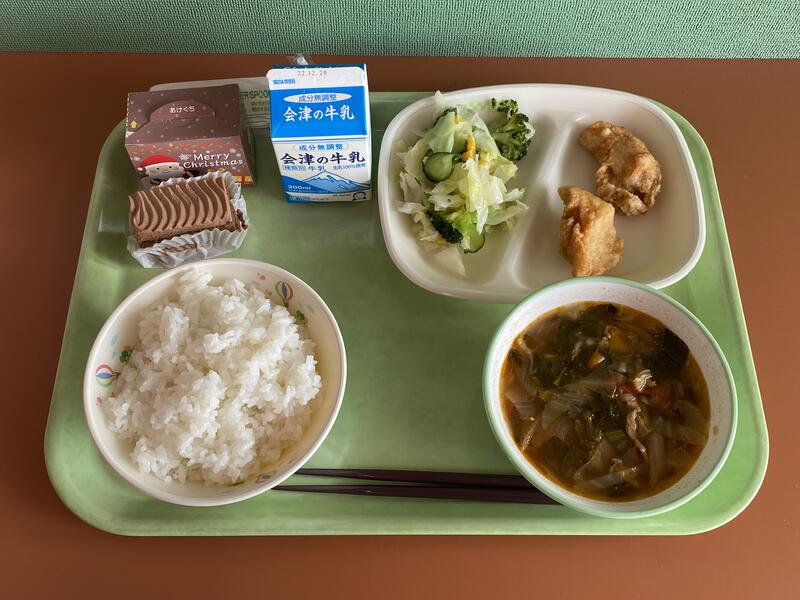 今日の献立は、ごはん、フライドチキン、フレンチサラダ、トマトスープ、牛乳、お楽しみデザート(チョコレートケーキ)の「クリスマス献立」です (チョコレートケーキは箱から出して撮影しました)