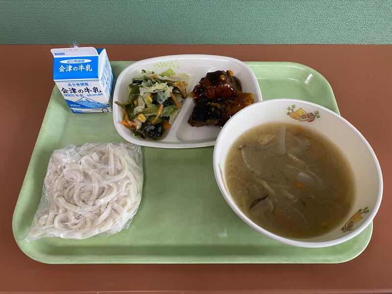 今日の給食 2022年12月22日 12時35分 今日の給食は、けんちんうどん、大学かぼちゃ、海藻サラダ、牛乳です。今日は冬至ということで、かぼちゃが出ました。けんちんうどんも具だくさんでおいしかったです