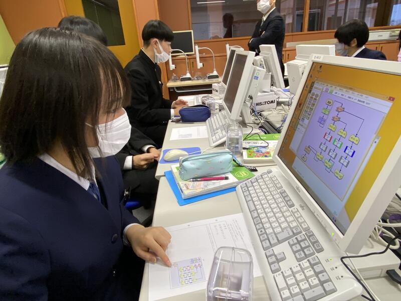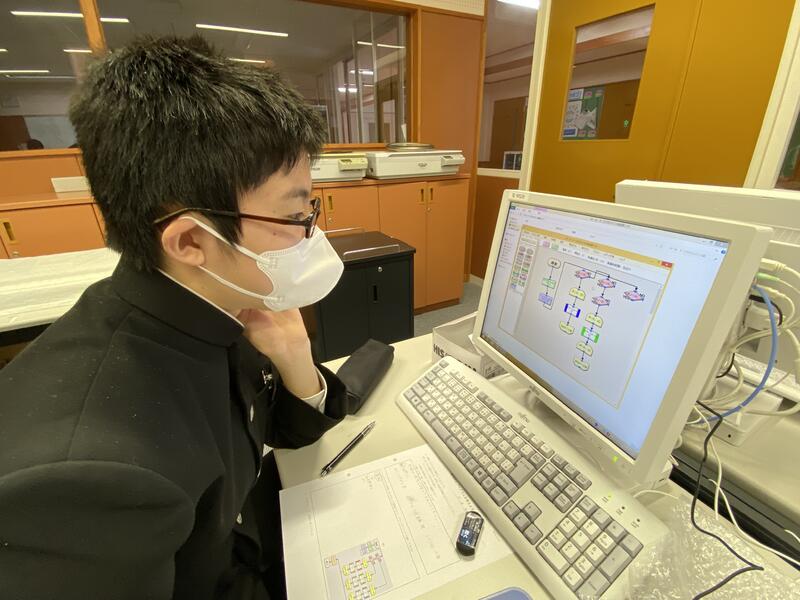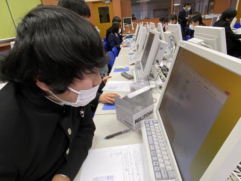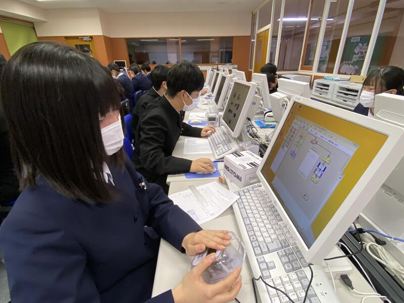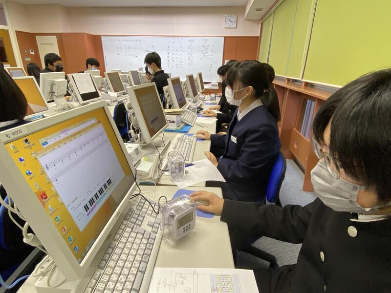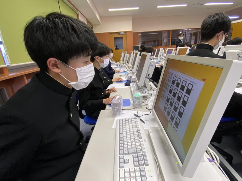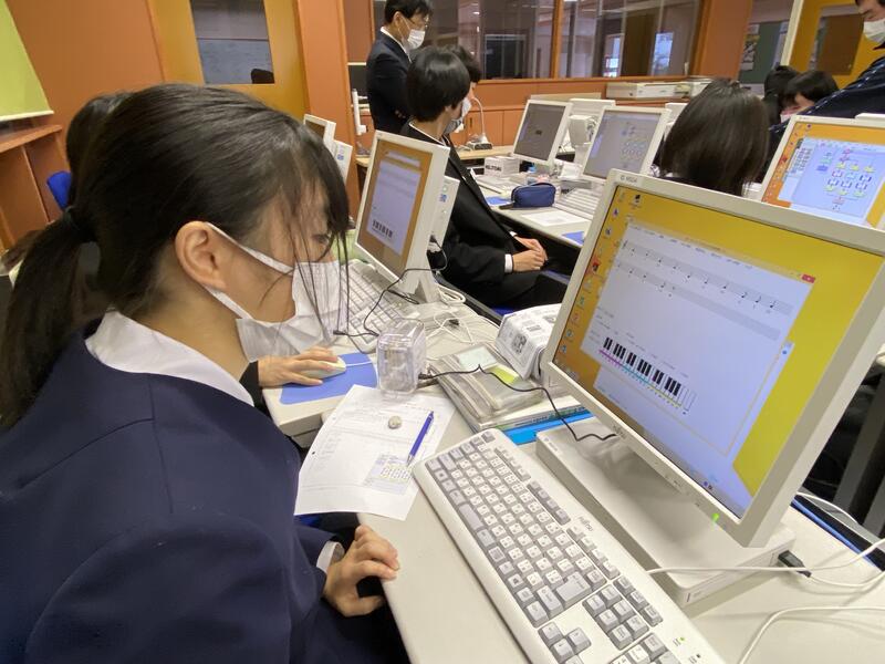 3年生の技術ではプログラミングについて学習しています。今日は、自分で製作したオーロラクロックにインストールする光や音のプログラムを考えました。何度もやり直したり、先生からアドバイスをもらったりしながら、自分好みのタイミングで光ったり、好きな音楽が流れたりするようにプログラミングしていました。