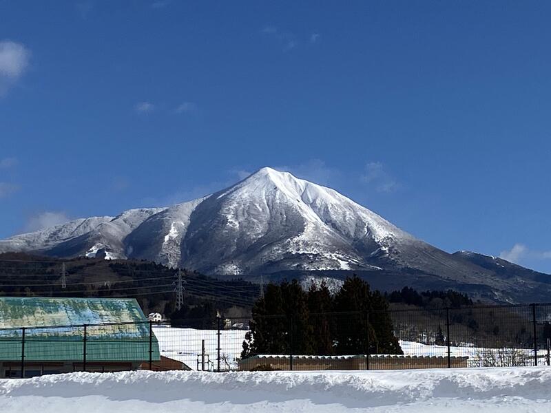 朝の吹雪から一転、青空が広がってきて、学校からは雪に覆われた名峰磐梯山も頂までキレイに見えます 終業式日和です