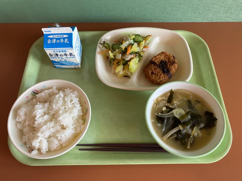 2022年12月23日 12時45分2学期最後の今日の給食は、ごはん、メンチカツ、塩昆布和え、わかめのみそ汁、牛乳でした。今日は町内の幼稚園、小学校は給食がなく、中学校のためだけに給食共同調理場の皆さんが給食を作ってくださいました。共同調理場の皆さん、ありがとうございます。今年も一年間、おいしい給食をありがとうございました。来年もよろしくお願いいたします