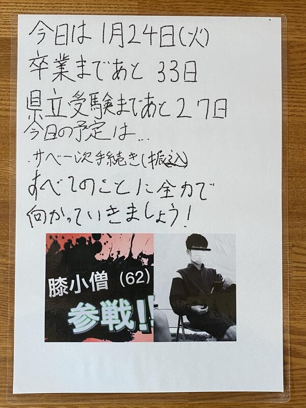 2023年1月24日 12時35分今日の卒業カレンダーはI・Tくんの作品です。15の春を笑顔で迎えるために、そして、最高の卒業生になるために、すべてのことに全力で向かっている3年生です 目隠しはされていますが、写真の彼に見覚えが…。もしや、卒業カレンダートップバッターの彼が「膝小僧」なのか…!? 確認したい方はコチラからどうぞ