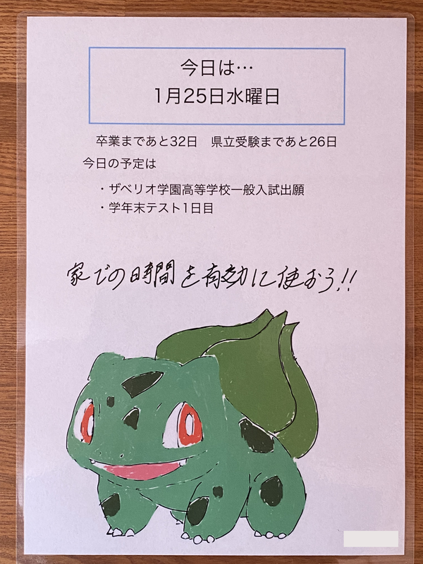 今日の卒業カレンダーはT・Tくんの作品です。これはポケモンのフシギダネですね。3年生の皆さん、家での時間を有効に使って、合格GETだぜっ!