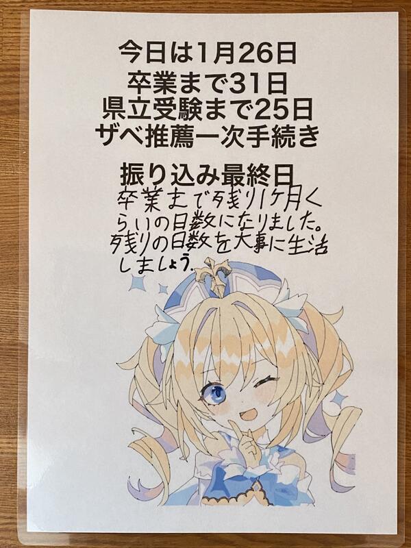 2023年1月26日 09時35分今日の卒業カレンダーはK・Dくんの作品です。卒業までの登校日がまもなく30日を切りますね。友との語らい、日々の授業、おいしい給食などなど何気ない中学校での日常を懐かしく思う日がくるのでしょうね。3年生の皆さん、ぜひ、卒業までの残りの日々を大切にしてくださいね。