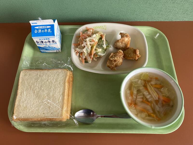 今日の給食は、食パン、フライドチキン、ツナサラダ、コンソメスープ、牛乳でした。今日は「世界の料理」がテーマの献立でした。ごちそうさまでした。