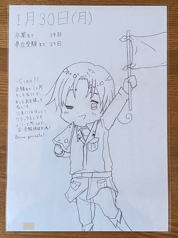 2023年1月30日 09時00分今日の卒業カレンダーはO・Mさんの作品です。とうとう卒業までの登校日が30日を切りました。O・Mさんの言うとおり、受験勉強の合間に気分転換をしてリラックスすることも必要ですよ 緊張とリラックスのバランスを取りながら今週も顔晴ります 「Buona giornata !」とはイタリア語で「よい1日を!」という意味です それでは皆さん、今日も「Buona giornata !」