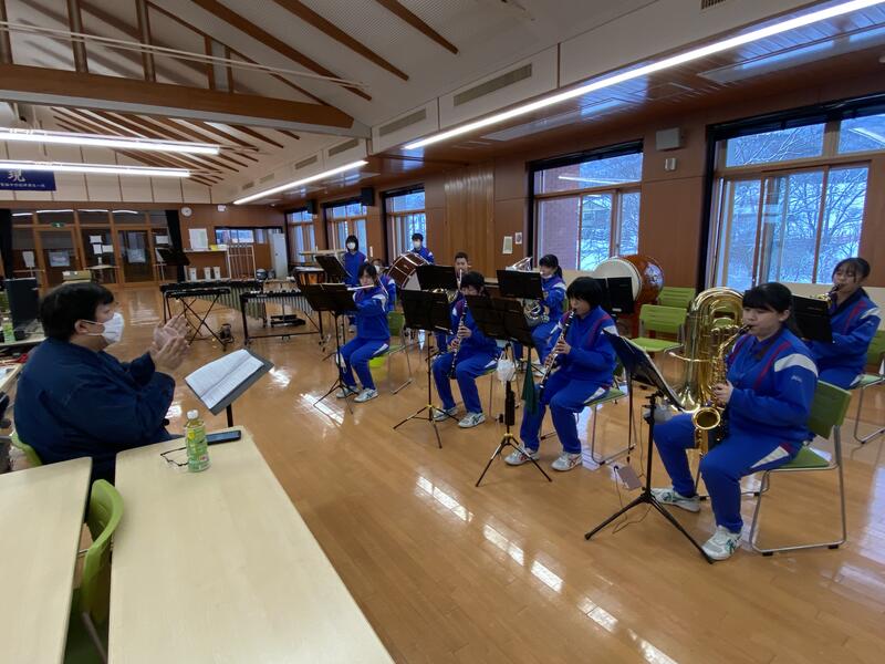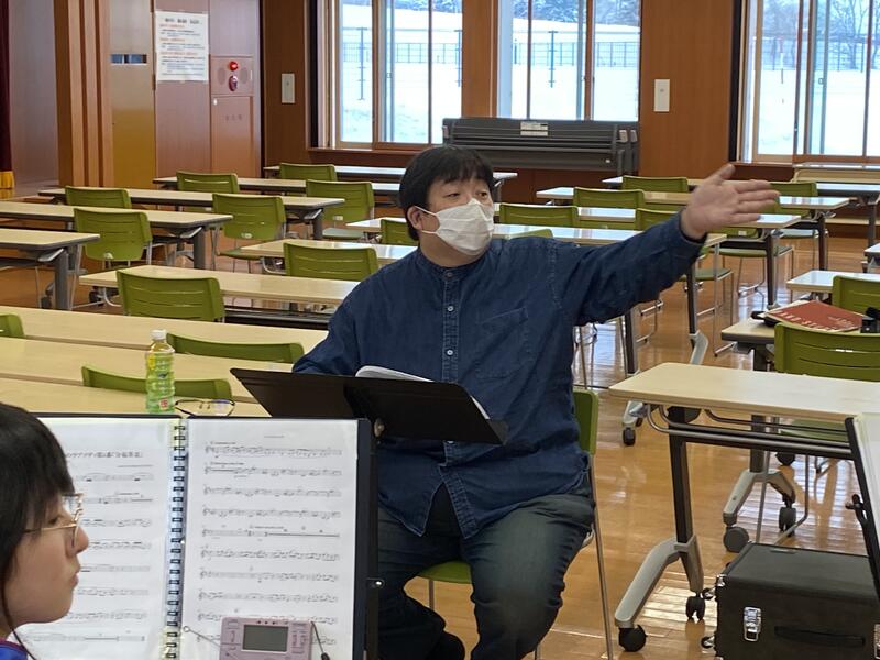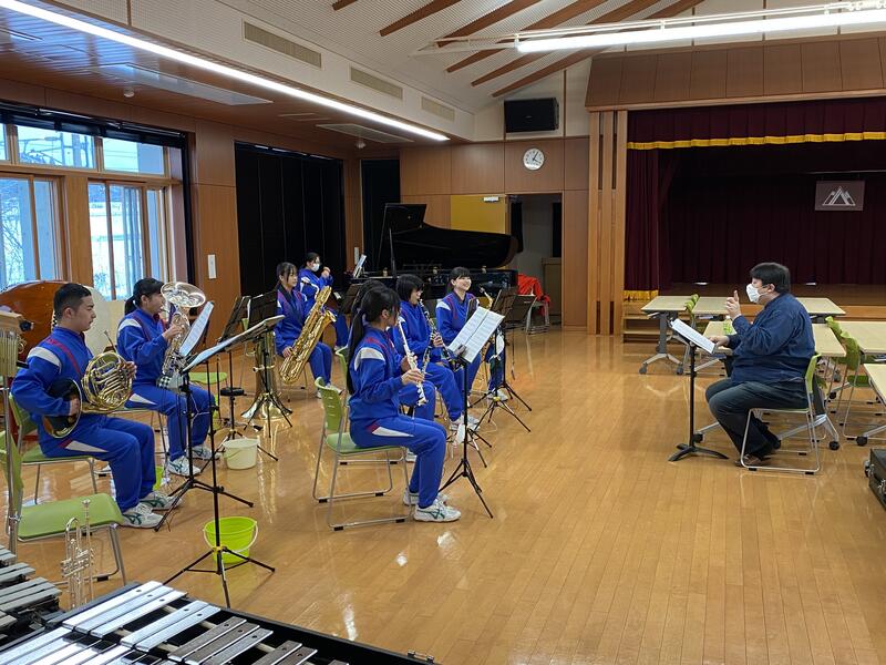 2023年1月27日 16時45分昨年の11月に引き続き、本日、国内外のオーケストラの指揮者としてご活躍されている堺 武弥先生を講師にお招きして、アンサンブル部の特別レッスンを実施しました。来年度のコンクールで演奏する曲について、堺先生からユーモアを交えながらアドバイスをいただきました。生徒たちは堺先生のアドバイスを真剣に聴いて、よりよい演奏にしようと一生懸命練習していました 堺先生、本日はどうもありがとうございました