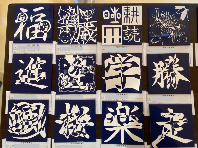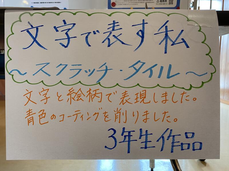 磐中美術館が玄関ホールで開館し、3年生によるスクラッチ・タイル展が開催されています。自分のお気に入りの文字や言葉を絵柄を組み合わせて制作しました。どれもステキな作品です 先日行われた3学年保護者会の際に、保護者の皆様にもご覧いただくことができました。