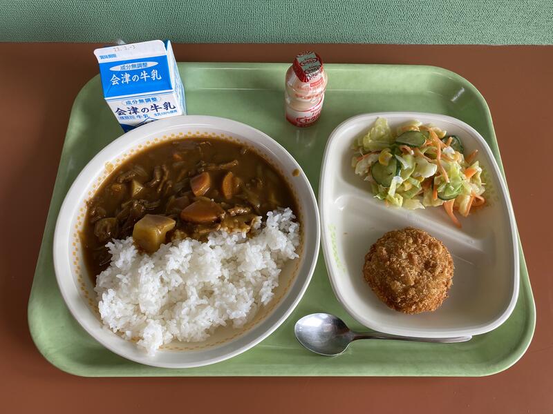 今日の給食は、カレーライス、チキンカツ、コールスローサラダ、ヤクルト、牛乳です。ごちそうさまでした。
