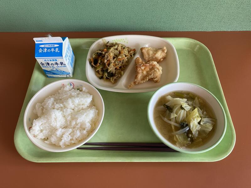 今日の給食は、ごはん、鶏のからあげ(塩味)、切り干し大根のカレー炒め、キャベツのみそ汁、牛乳です。ごちそうさまでした。