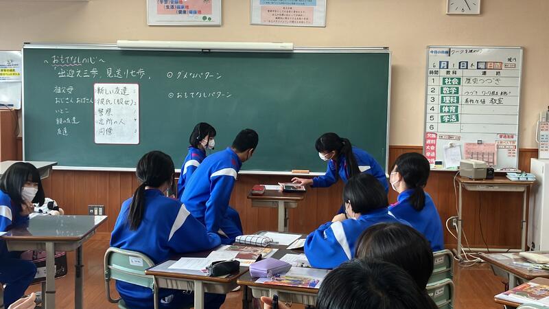 2023年6月2日 11時00分3年生が、道徳の時間に「おもてなしの心」について学習し、それをうけてシチュエーションごとにおもてなしについて寸劇をすると聞いたので、ワクワクしながら授業の様子を見に行きました。