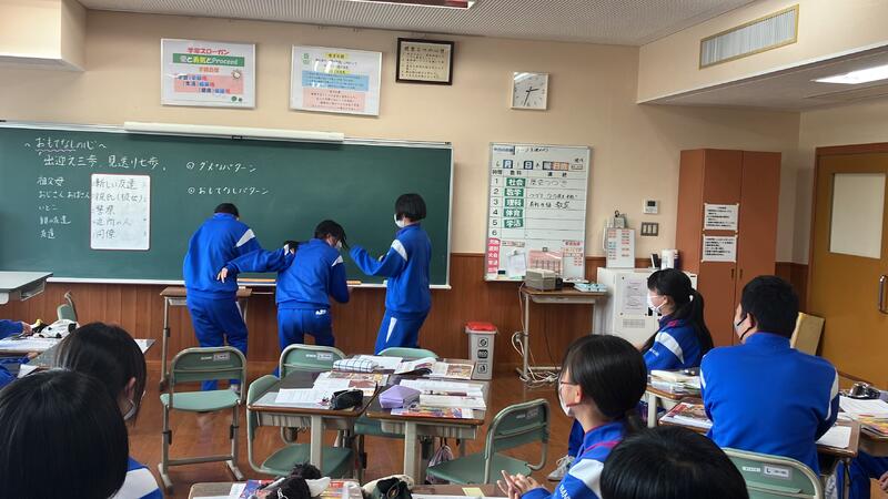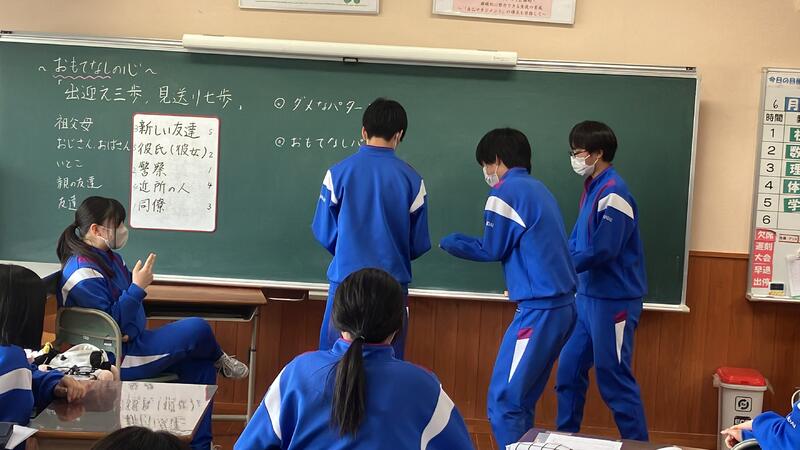 班ごとに、場面(立場)を設定し、ダメなパターンとおもてなしパターンの2つについて発表しました。