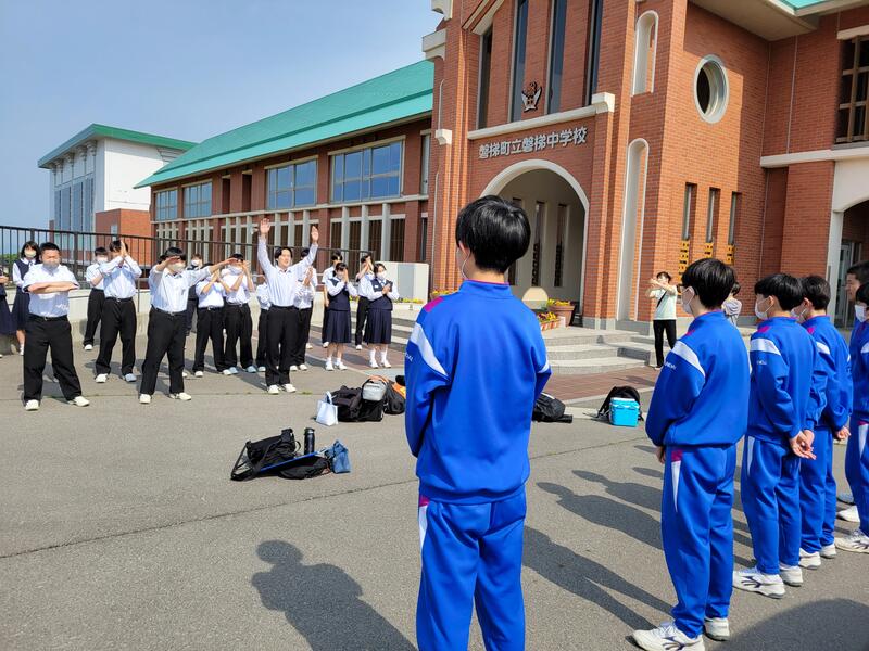 バスケ部が出発するとき、学校に残る生徒たちが応援のエールで見送りしてくれました。学校全体でみんなを応援している姿に感動します。