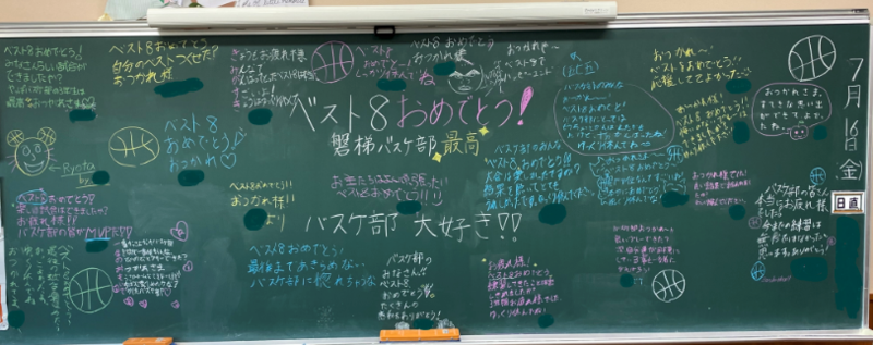 2021年7月16日 18時11分放課後、校舎内の見回りで3年生教室に行ってみると、バスケ部の健闘を称え、ベスト8入りを祝福するメッセージが黒板にびっしりと書かれていました。さすがは、バスケ部の仲間のために集団脱走を試みた3年生たちです!(笑)
