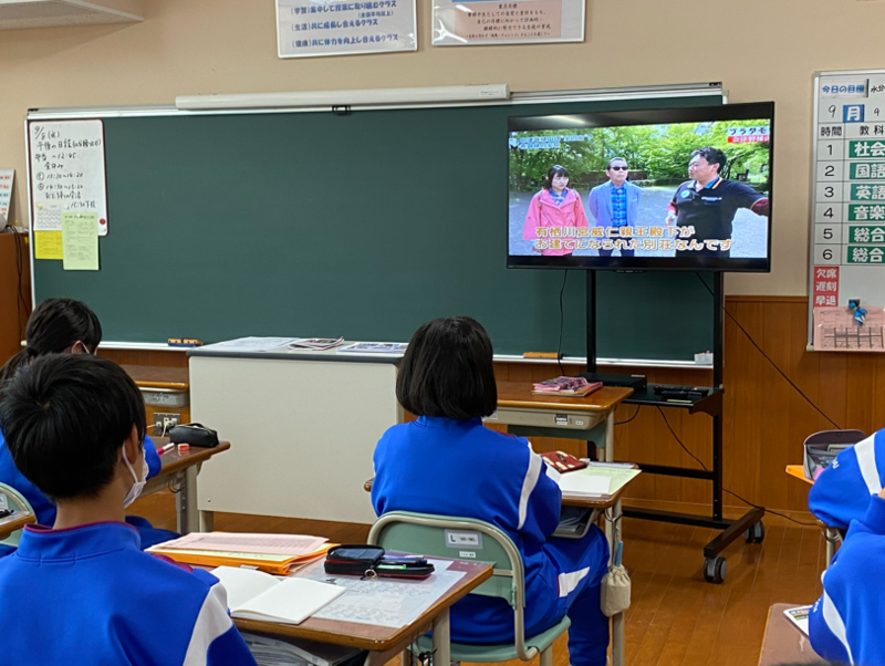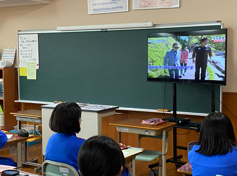 1年生が見ていたのは、今から5年前の2016年7月16日にNHKで放送された「ブラタモリ」でした。このときは「会津磐梯山 ~会津磐梯山は“宝の山”?~」というタイトルで放送され、数々の宝を生み出す磐梯山の知られざる姿が紹介されています。昨日ガイドしてくださった蓮岡さんが映ると拍手が沸き起こり、昨日、自分たちが実際に歩いた場所や見た風景が映ると、「昨日と同じところだ」とつぶやいたりうなずいたりしながら、昨日のことを思い出し、磐梯山について復習をしていました。