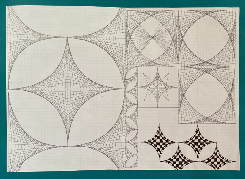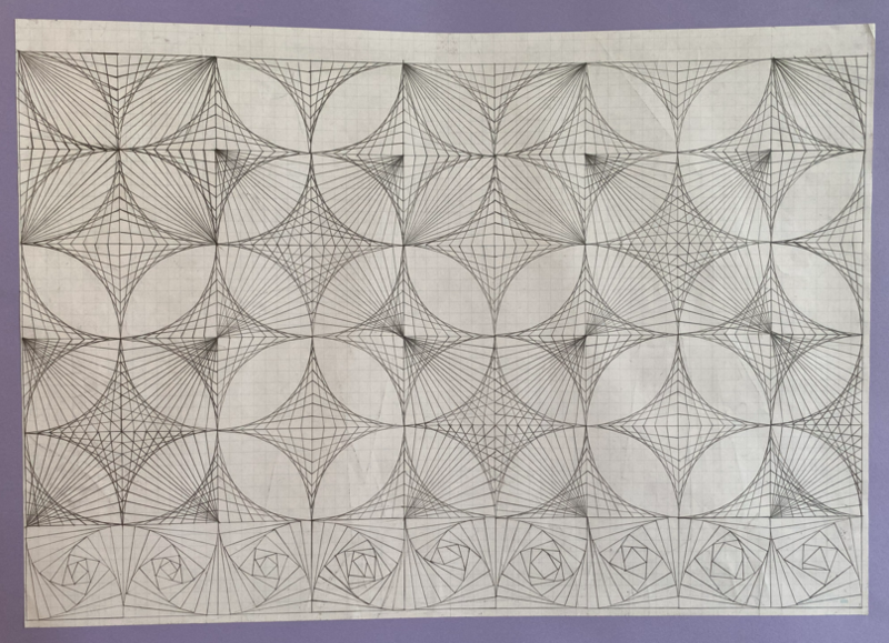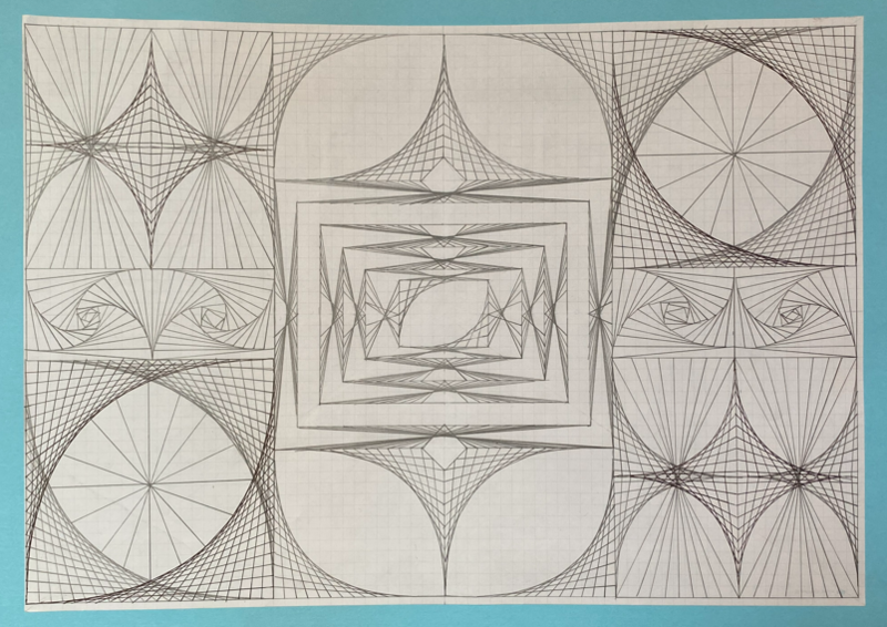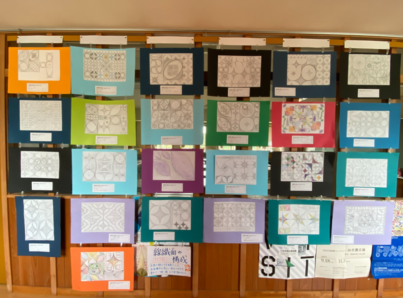 2021年10月8日 10時30分2年生が美術の授業で取り組んだ線織面の作品が展示されています。どの作品も一本一本の線が細かくていねいにかかれていて、すばらしい作品に仕上がっています(^^)/ こういう幾何学模様が好きな私は、しばしの間見入ってしまいました。