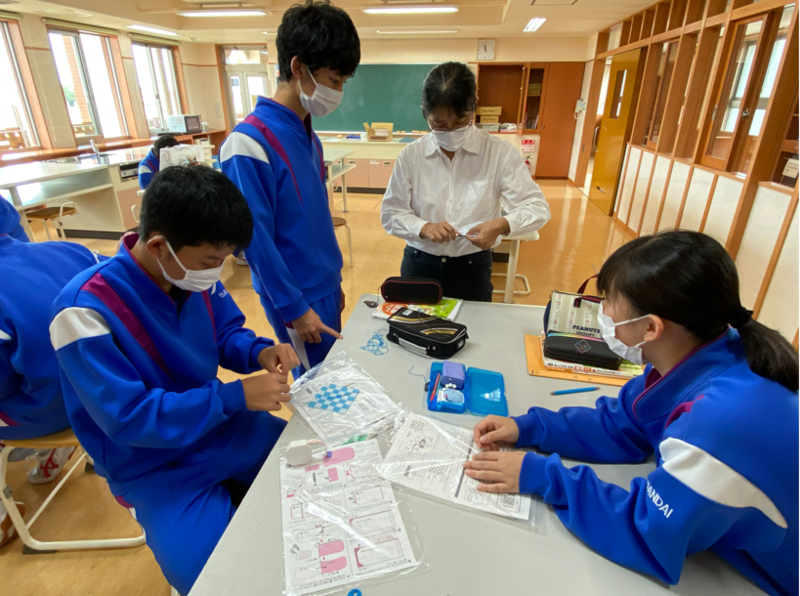 一方、家庭の授業では、織物の基本である「平織」「綾織」「朱子織」の三原組織(さんげんそしき)に取り組んでいました。細かい作業ですが、ていねいに取り組んでいました。