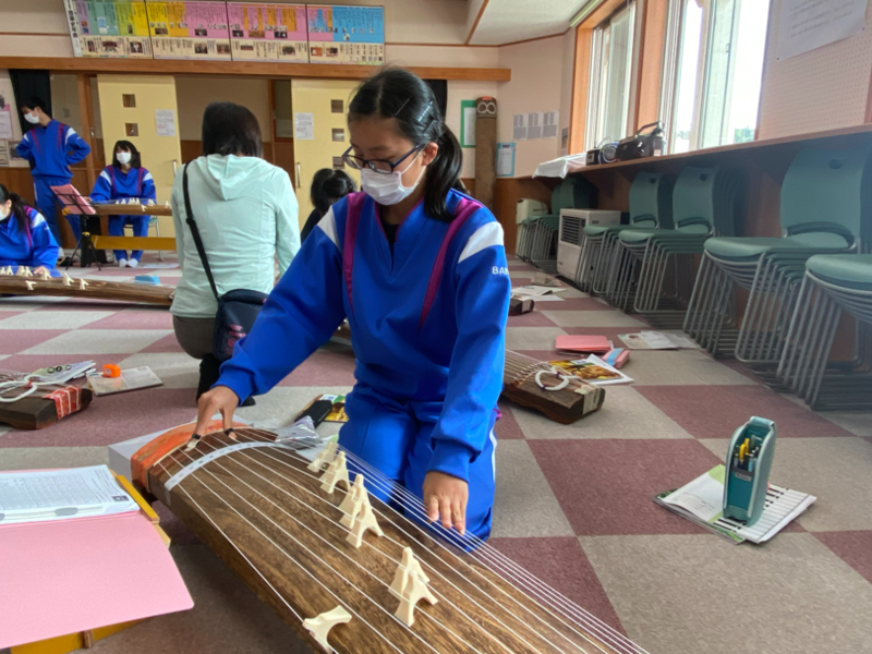 2021年10月15日 11時10分1年生の音楽での「琴」の授業も佳境を迎えました! 今日はいよいよ一人ずつ「さくらさくら」を歌いながら演奏するテストです みんなの前で演奏するので緊張していたようですが、全員、最後まで弾くことができました すばらしい上達ぶりです 授業の最後には、みんなで「さくらさくら」を演奏しました