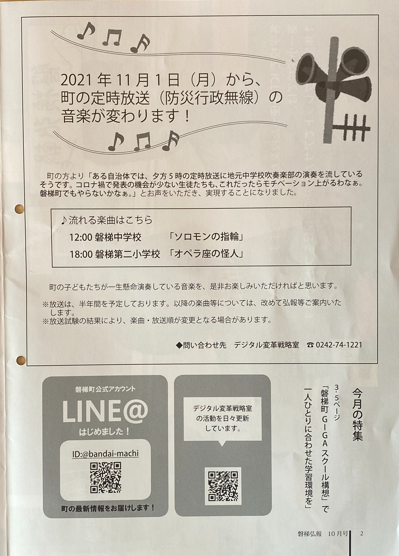 2021年10月15日 13時15分学校だより19号でもお知らせいたしましたが、11/1(月)から毎日12:00に流れている町の定時放送で、アンサンブル部が演奏した「ソロモンの指輪」を流していただけることになり、町の広報誌「磐梯弘報10月号」にその案内が載っています。