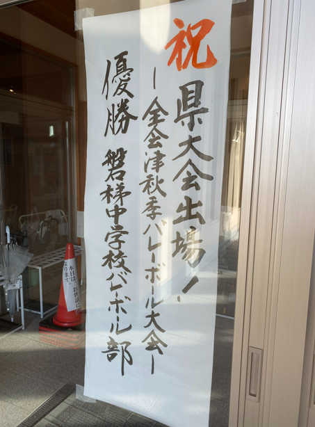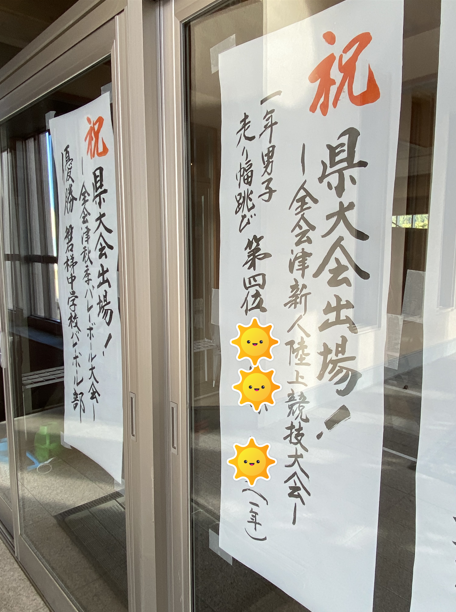 2021年10月18日 08時45分県大会出場を称える張り紙が玄関に掲示されています 書いてくださったのは、もちろん国語科のK先生です!