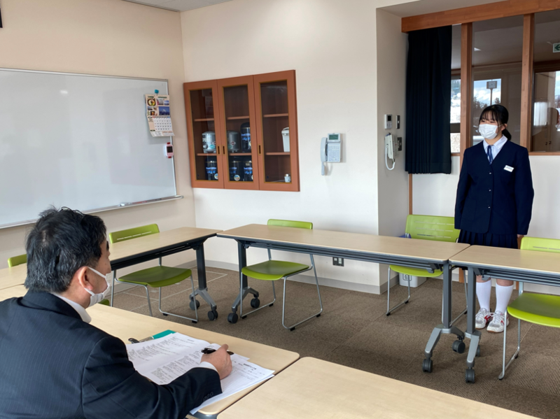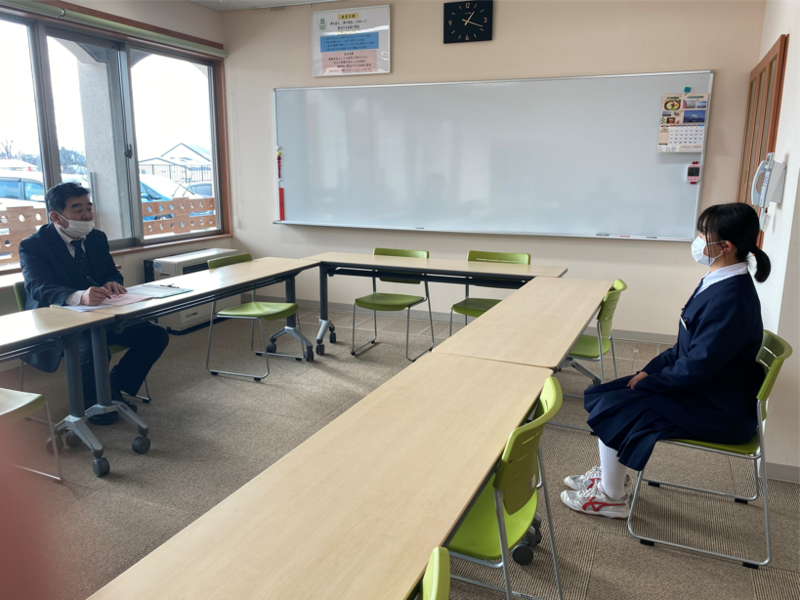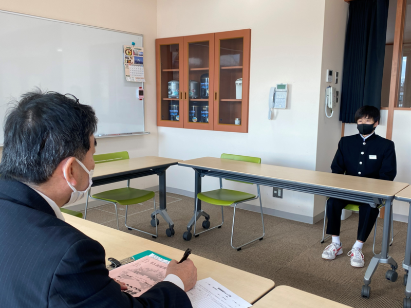 2021年12月20日 13時30分3年生は私立高校入試に向けて面接の準備、練習に余念がありません。昼休みや放課後の時間に、いろいろな先生方に協力してもらいながら、面接練習に取り組んでいます。今日の昼休みは会議室で面接練習を行っていました。面接官の先生は、ふだん授業で教わっていて慣れている先生なのですが、面接となるとやはり雰囲気や勝手が違って緊張していたようですが、その緊張が本番で生きてくるのです。緊張しながらも面接官からの質問にきちんと答えていました 顔晴れっ、3年生 (^^)/