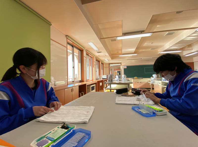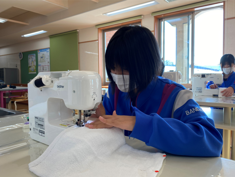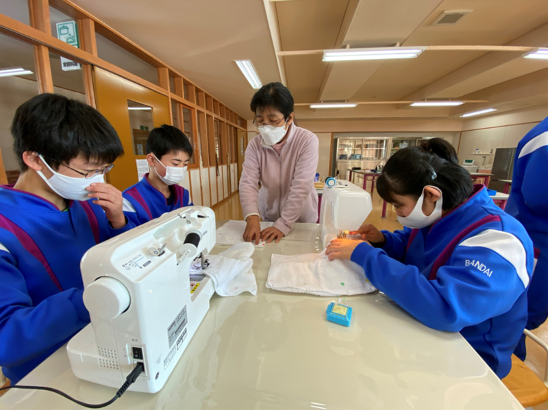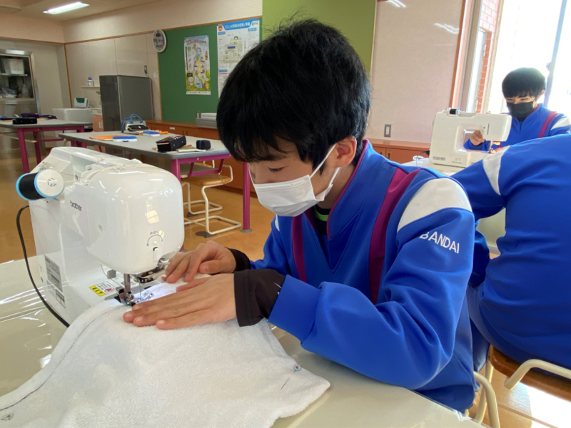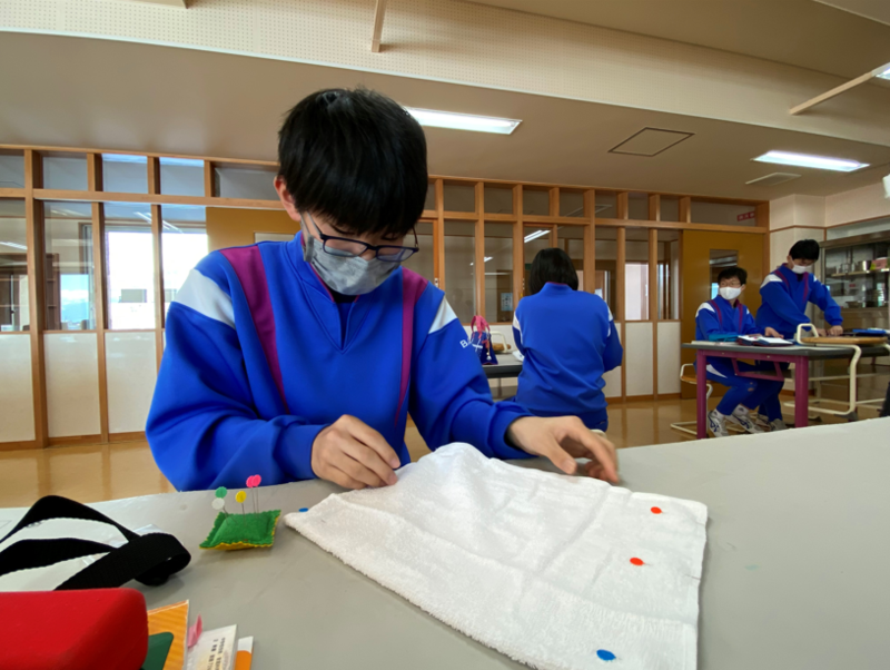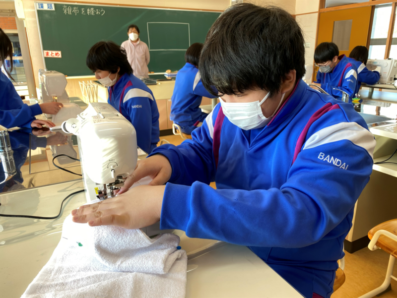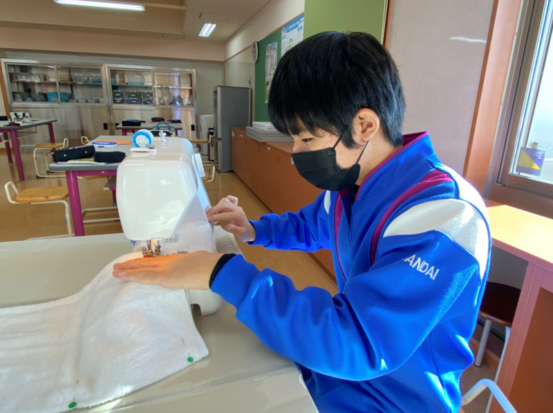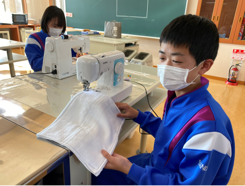 2021年12月20日 14時00分2年生のもう半分のグループは家庭の授業で、ミシンの使い方の学習を行っていました。年末の大掃除に向けて、ミシンを使ってぞうきん作りに取り組んでいました。タオルにまち針を刺したあと、ミシンを使ってていねいに縫っていきます。「あぁ、曲がっちゃった!」なんて声も聞こえましたが、生徒たちはミシンに慣れてくるとスムーズにまっすぐ縫うことができるようになっていきました。2年生全員が立派なぞうきんを完成させることができましたので、年末の大掃除はバッチリですね