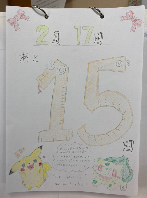 2022年2月17日 14時05分卒業まで残り15日となった本日の卒業カレンダーです。お、ポケモンのイラストが描かれています。これはピカチュウとフシキダネですね 残り15日、まだまだみんなでたくさんの思い出ゲットだぜっ そして、全員が志望高校合格もゲットだぜっ