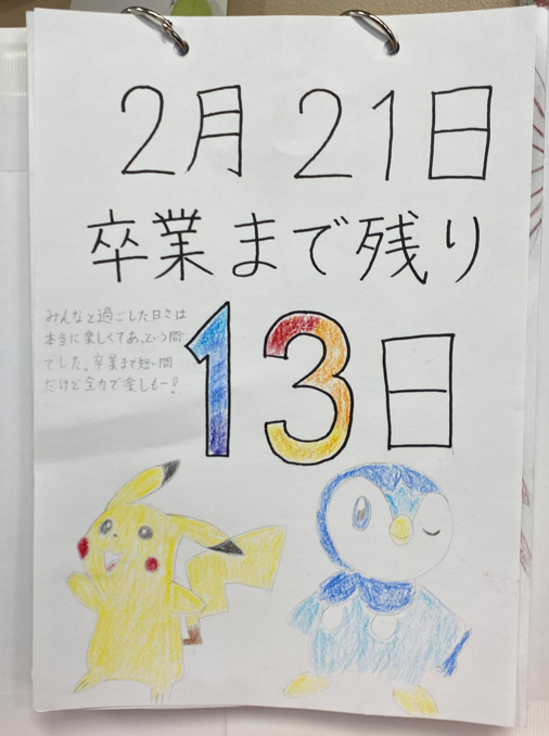 2022年2月21日 15時35分卒業まで残り13日となった本日の卒業カレンダーです。またまたポケモンの登場です。今回はピカチュウとポッチャマですね。我が家の子どもたちが小さい頃、ポッチャマのぬいぐるみがウチにありました 卒業カレンダーの写真を撮影しに行った本日の昼休みも、3年生教室からは笑い声が聞こえていました。卒業まで全力で楽しむ3年生の姿がありました あ、もちろん入試に向けて勉強したり、面接の練習をしたりする姿も見られました