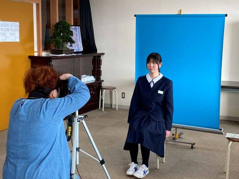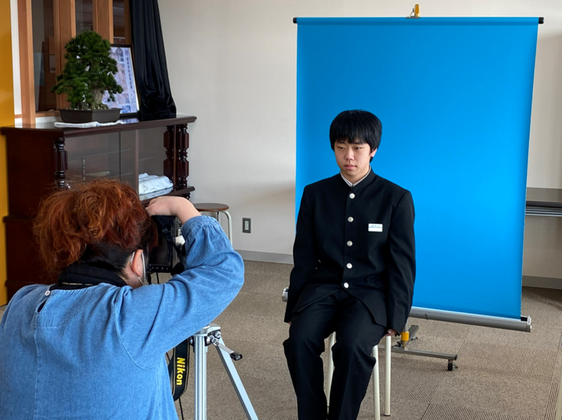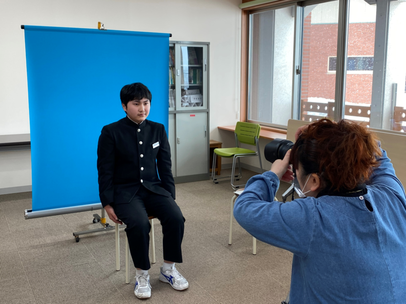 2022年2月24日 16時20分今日の6校時目に、1・2年生が来年度の身分証明書(IDカード)用の写真を撮影しました。写真屋さんに来ていただいて服装や姿勢など細かなところまで確認しながらの写真撮影となりました。緊張で表情が硬い生徒もいる反面、吹き出すほど笑ってしまう生徒もいました