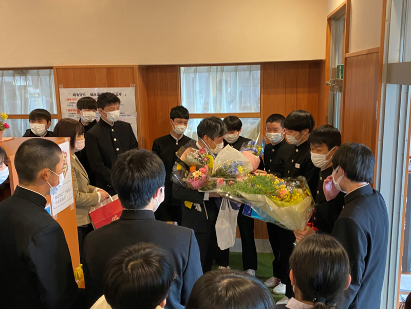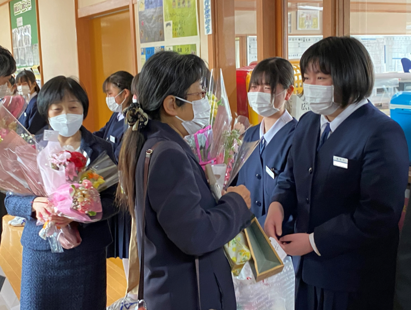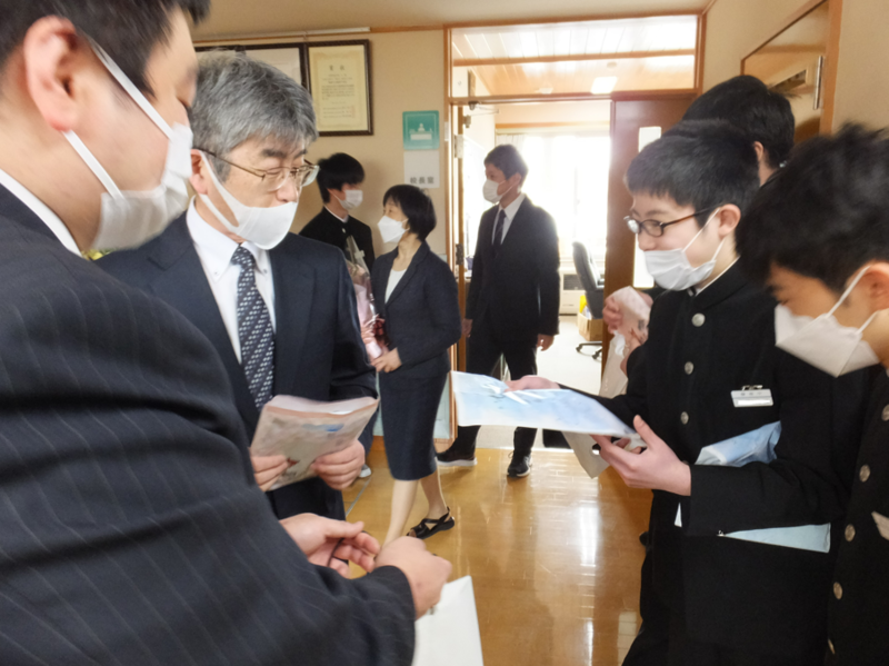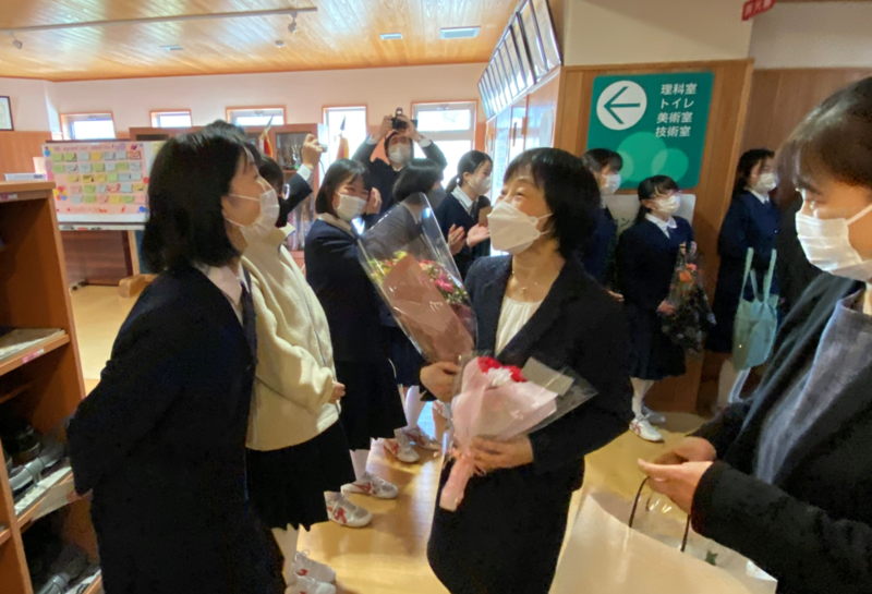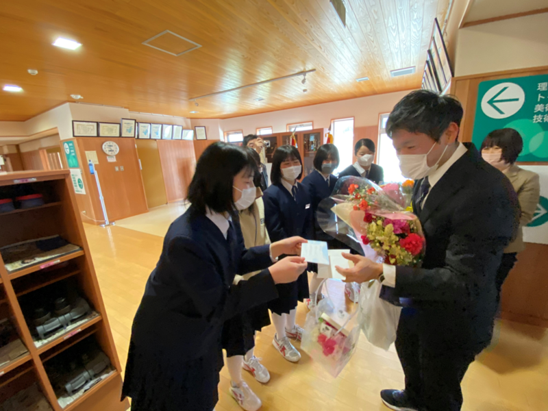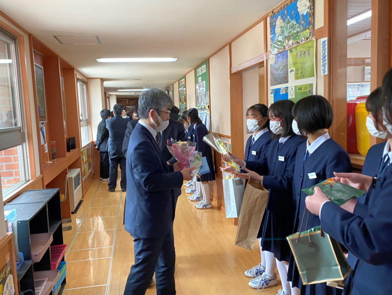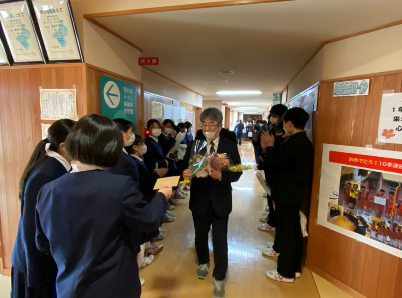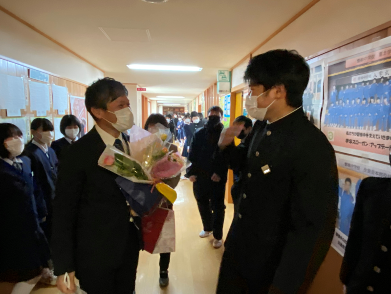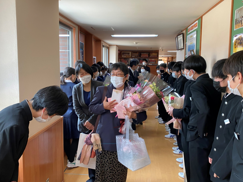 離任式 その3 2022年3月30日 14時55分 3/28に行われた離任式後の見送りの様子です。当日は、朝、小雨がパラついていたので校舎内での見送りとなりました。お世話になった先生方との別れに涙が止まらない生徒もいました