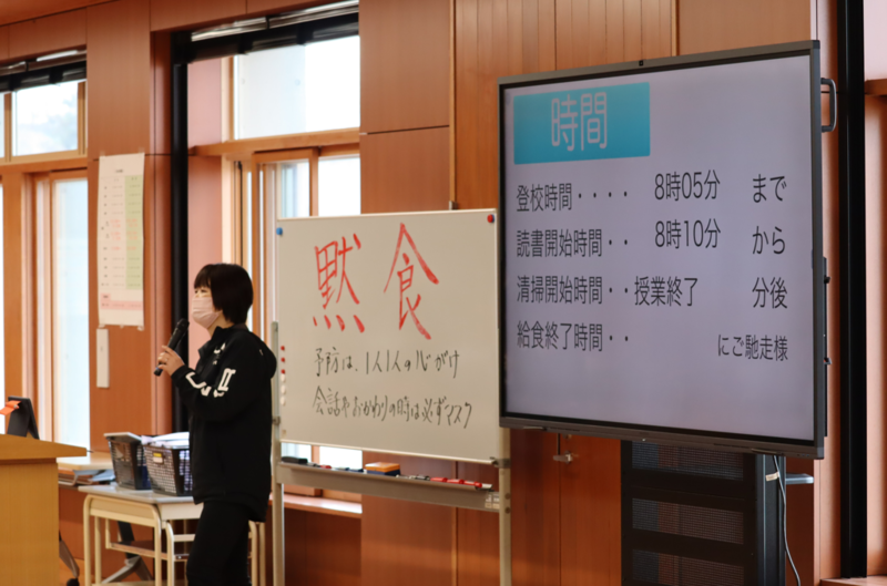 昨日の1校時目に全校オリエンテーションを行いました 中学校生活のルールや学習、部活動や給食などについて、それぞれの担当の先生からお話がありました。ときどき生徒への質問やインタービューもあったこともあり、2・3年生はほとんどわかっている話でしたが、最後まで気を抜くことなく(気を抜けず!?)、しっかりと話を聴いていました。もちろん、はじめて知ることばかりの1年生も真剣に話を聴いていました!