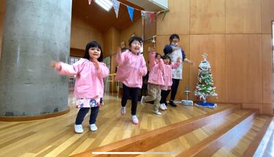 その頃、年少さんは、みんなで歌って踊って、こちらも体を動かしています。