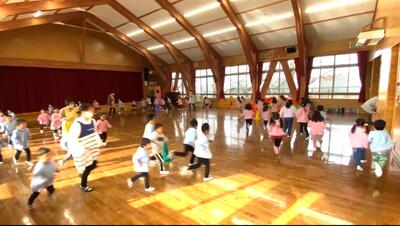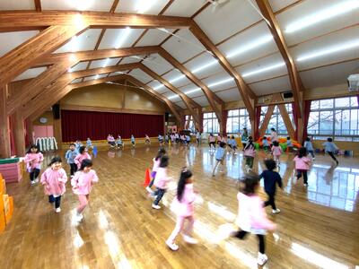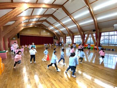 運動不足になりがちな冬場、年長さんと年中さんは、毎朝、お遊戯室を走っています。名付けて、朝ラン