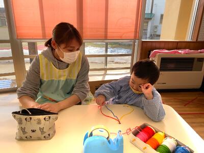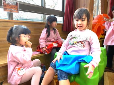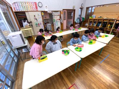 年中さんと年長さんは、それぞれ、製作遊び、絵本、パズルと、今日は椅子に座って遊ぶ時間が多かったようですね。